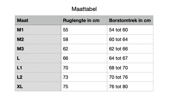 Er is een maattabel toegevoegd aan de afbeeldingen, zo weet u welke maat uw hond nodig heeft. Klik hier om te weten hoe u de hond opmeet. Deze maten zijn standaard, wenst u een andere maat of heeft u vragen? Contacteer ons!
