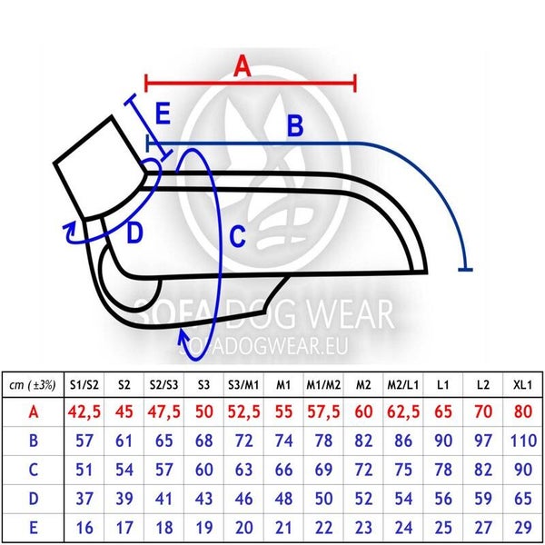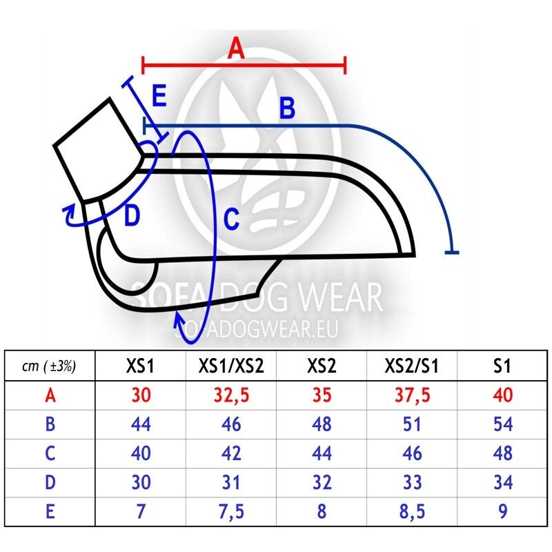 - Opmerking: Sofa Dog Wear werkt ook met tussenmaten (zoals S1/S2, S2/S3, S3/M1, M1/M2, M2/L1, …).Deze vallen telkens tussen twee standaardmaten in en zorgen voor een nog betere pasvorm.Twijfel je tussen twee maten? Kies dan best de tussenmaat als die beschikbaar is.